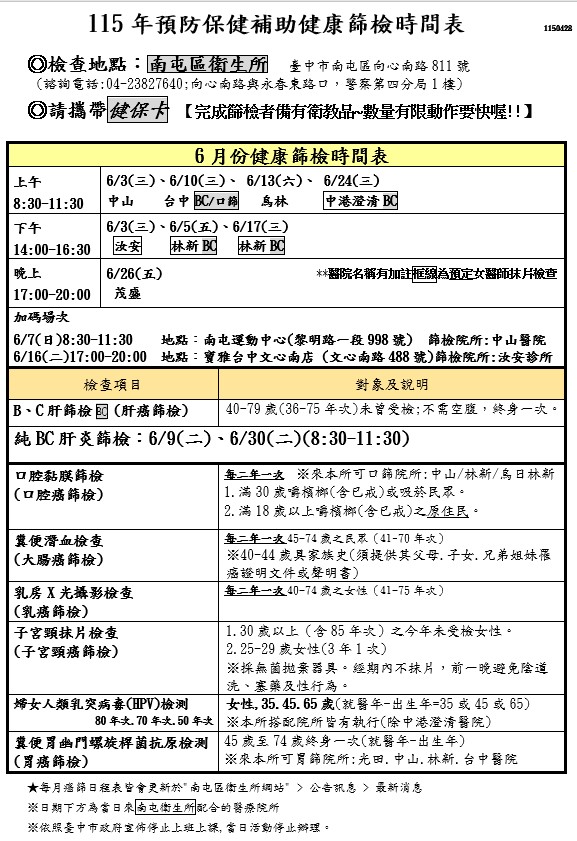 • 發布單位: 臺中市南屯區衛生所